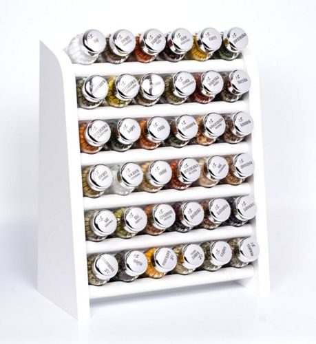 Półka z przyprawami polskiej firmy GALD wykonana z drewna bukowego trwale pokrytego potrójną warstwą lakieru ekologicznego. Pojemniki szklane z plastikowymi nakrętkami dostępne w wersji matowej lub z połyskiem.