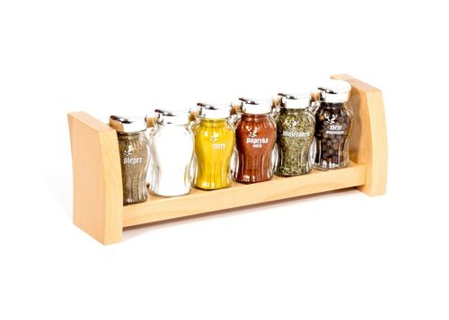 Półka z przyprawami polskiej firmy GALD wykonana z drewna bukowego trwale pokrytego potrójną warstwą lakieru ekologicznego. Pojemniki szklane z plastikowymi nakrętkami dostępne w wersji matowej lub z połyskiem.