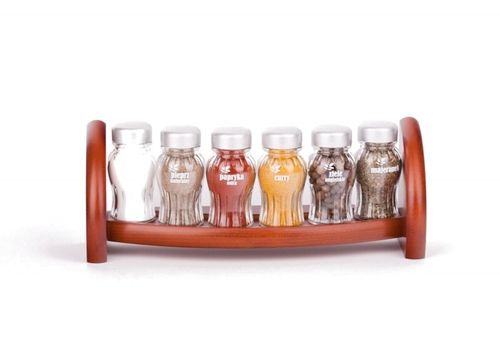 Półka z przyprawami polskiej firmy GALD wykonana z drewna bukowego trwale pokrytego potrójną warstwą lakieru ekologicznego. Pojemniki szklane z plastikowymi nakrętkami dostępne w wersji matowej lub z połyskiem.