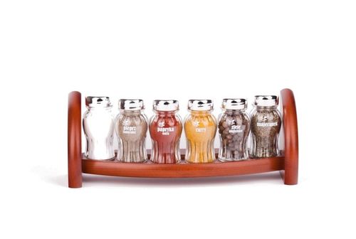 Półka z przyprawami polskiej firmy GALD wykonana z drewna bukowego trwale pokrytego potrójną warstwą lakieru ekologicznego. Pojemniki szklane z plastikowymi nakrętkami dostępne w wersji matowej lub z połyskiem.