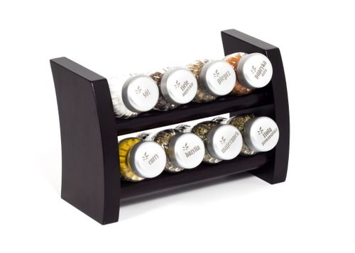 Półka z przyprawami polskiej firmy GALD wykonana z drewna bukowego trwale pokrytego potrójną warstwą lakieru ekologicznego. Pojemniki szklane z plastikowymi nakrętkami dostępne w wersji matowej lub z połyskiem.