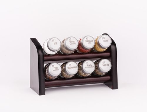 Półka z przyprawami polskiej firmy GALD wykonana z drewna bukowego trwale pokrytego potrójną warstwą lakieru ekologicznego. Pojemniki szklane z plastikowymi nakrętkami dostępne w wersji matowej lub z połyskiem.