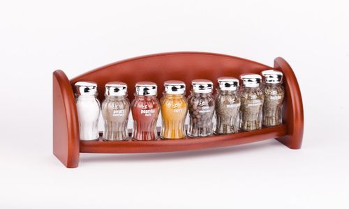 Półka z przyprawami polskiej firmy GALD wykonana z drewna bukowego trwale pokrytego potrójną warstwą lakieru ekologicznego. Pojemniki szklane z plastikowymi nakrętkami dostępne w wersji matowej lub z połyskiem.