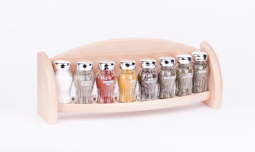 Półka z przyprawami polskiej firmy GALD wykonana z drewna bukowego trwale pokrytego potrójną warstwą lakieru ekologicznego. Pojemniki szklane z plastikowymi nakrętkami dostępne w wersji matowej lub z połyskiem.