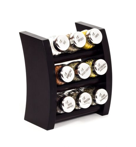 Półka z przyprawami polskiej firmy GALD wykonana z drewna bukowego trwale pokrytego potrójną warstwą lakieru ekologicznego. Pojemniki szklane z plastikowymi nakrętkami dostępne w wersji matowej lub z połyskiem.