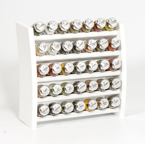 Półka z przyprawami polskiej firmy GALD wykonana z drewna bukowego trwale pokrytego potrójną warstwą lakieru ekologicznego. Pojemniki szklane z plastikowymi nakrętkami dostępne w wersji matowej lub z połyskiem.