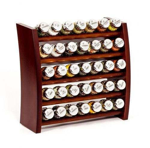 Półka z przyprawami polskiej firmy GALD wykonana z drewna bukowego trwale pokrytego potrójną warstwą lakieru ekologicznego. Pojemniki szklane z plastikowymi nakrętkami dostępne w wersji matowej lub z połyskiem.