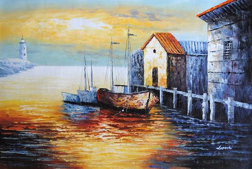 Wyrazisty obraz olejny namalowany szpachlą i pędzlem na płótnie! Kompozycja charakteryzuje się ciepłą i sentymentalną kolorystyką. Przedstawia kutry rybackie w porcie. Atrakcyjna praca malarska do wszystkich wnętrz!