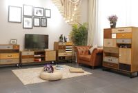 Asymetryczne ułożenie szuflad i drzwi przełamuje prostą formę mebli. Połączenie ciemnych nóżek i jasnych korpusów wraz ze zróżnicowanymi kolorystycznie i strukturowo szufladami i drzwiami, tworzą niebanalną elegancję i charakter tej kolekcji.