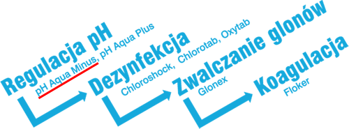 Preparat pH AQUA MINUS jest płynnym preparatem do obniżania pH wody w basenach kąpielowych. Może być stosowany w zalecanych stężeniach z innymi środkami do utrzymywania czystości basenów. Preparat pH AQUA MINUS nie zawiera jonów chlorkowych. SPOSÓB UŻYCIA: Odczyn pH wody basenowej powinien wahać się w granicach od 7,0 do 7,4. Każde odchylenie od tego poziomu powoduje osłabienie działania stosowanych środków dezynfekcyjnych, podrażnienie spojówek, podrażnienia skóry, korozję elementów metalowych itp. W celu obniżenia pH o 0,1 jednostki, należy użyć 100 ml preparatu pH AQUA MINUS na każde 10 m3 wody. Preparat można dozować za pomocą automatycznej stacji dozującej. W basenach przydomowych bez automatycznej stacji dozowania roztwór wodny preparatu pH AQUA MINUS należy wlać bezpośrednio do basenu w pobliżu dopływu wody w czasie gdy w basenie nie ma kąpiących się osób. Ze względu na wysokie stężenie kwasu należy zachować ostrożność przy przelewaniu. Przy ewentualnym rozcieńczaniu należy preparat wlewać do wody nigdy odwrotnie. Do mycia basenu zaleca się stosowanie produktu BRINK. C