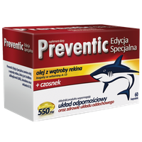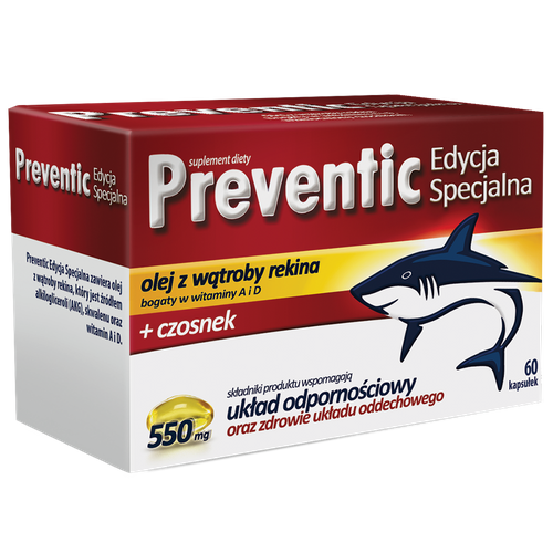 Suplement diety Preventic Edycja Specjalna zawiera bezzapachowy czosnek 50 mg oraz wysoką dawkę oleju z wątroby rekina 500 mg w jednej kapsułce. Dostarcza on alkilogliceroli (AKG), skwalenu oraz witaminy A i D. Składniki produktu wspierają naturalne mechanizmy obronne (czosnek), prawidłowe funkcjonowanie układu odpornościowego (witaminy A i D), pomagają w utrzymaniu dobrego widzenia (witamina A), zdrowych kości i zębów (witamina D).