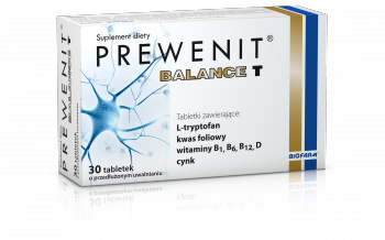 Suplement diety Prewenit® Balance T zawiera L-tryptofan, witaminy: D, B1, B6, B12, kwas foliowy oraz cynk.