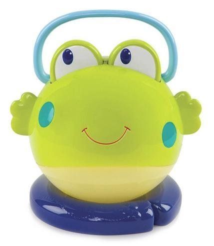 Projektor i lampka w jednym. Wesoła lampka w kształcie żabki pomoże w uspokojeniu i w zasypianiu Twojego maluszka. Łagodne światełka bądź kolorowe gwiazdki, wyświetlane przez projektor przy dźwiękach delikatnych melodii oraz dźwięków natury umilą i rozświetlą każdą ciemność. Żabka posiada owalną konstrukcję, dzięki której można ustawiać ją w różnym stopniu nachylenia na podstawce dołączonej do zestawu. W ten sposób mamy możliwość wyboru wyświetlenia gwiazdek na ścianie bądź na suficie. Żabka posiada rączkę, dzięki której dziecko może zabrać ją ze sobą rozjaśniając drogę w ciemności. Lampka posiada 2 nastawy czasowe - 15 i 30min. Zabawkę możemy włączać/wyłączać naciskając na oczy żabki.