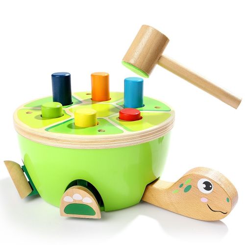 Zabawka posiada 6 wystających elementów do wbijania. Jak tylko uda się wbić jeden z nich, odpowiednio łapka bądź główka żółwia wysuwaj się bądź chowa.