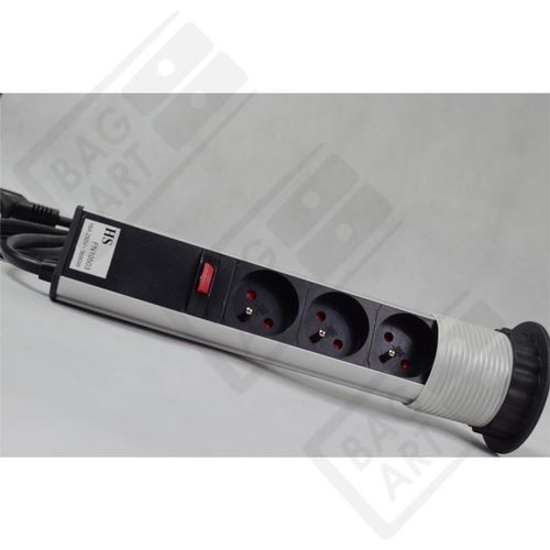 Przedłużacz chowany w blacie typu TOWER, 3 wtyczkiKolor: AluminiumStosowany w meblach kuchennych lub biurowych. Świetne rozwiązanie w przypadku braku gniazdek na ścianie za blatem lub w przypadku chęci zamontowania grafiki na szkle, takie rozwiązanie pozwala wtedy uniknąć konieczności tworzenia otworu w szkle, a co za tym idzie zmniejsza ryzyko pęknięcia szyby.
