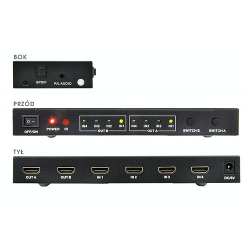 - 4 wejścia i 2 wyjścia HDMI z obsługą 4K x 2K (3840x2160 @ 30Hz)