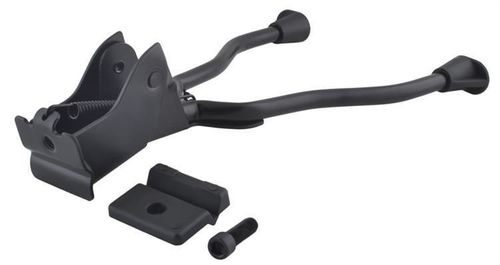Podwójna metalowa nóżka rowerowa do zamocowania z tyłu roweru (pomiędzy tylne koło). Mocowanie centralne, na śrubę. W zestawie podkładka dystansująca, która zabezpiecza rower przed zarysowaniem przy montażu nóżki oraz podwyższa nóżkę (możliwość zdjęcia podkładki).