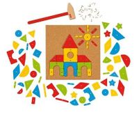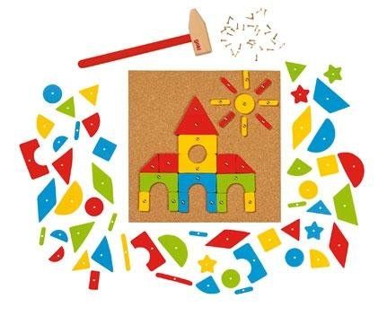 Zestaw do tworzenia kształtów z kolorowych figur. Za pomocą młotka należy przybijać je do korkowej planszy, a powstaną obrazki, jakie tylko podpowie wyobraźnia. Zestaw zawiera 118 elementów. Opakowanie zawiera: planszę korkową, różnokolorowe drewniane elementy z dziurkami, metalowe pinezki do przybijania, drewniany młotek oraz kartę z wzorami.