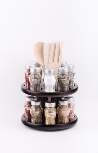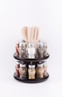 Stojak obrotowy z przyprawami polskiej firmy GALD wykonany z drewna bukowego trwale pokrytego potrójną warstwą lakieru ekologicznego. Pojemniki szklane z plastikowymi nakrętkami dostępne w wersji matowej lub z połyskiem.