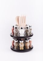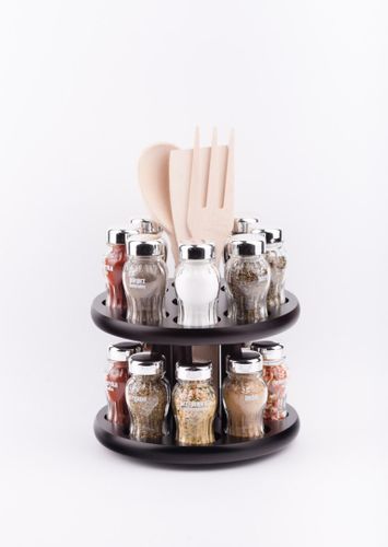 Stojak obrotowy z przyprawami polskiej firmy GALD wykonany z drewna bukowego trwale pokrytego potrójną warstwą lakieru ekologicznego. Pojemniki szklane z plastikowymi nakrętkami dostępne w wersji matowej lub z połyskiem.