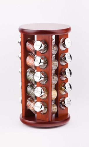 Stojak obrotowy z przyprawami polskiej firmy GALD wykonany z drewna bukowego trwale pokrytego potrójną warstwą lakieru ekologicznego. Pojemniki szklane z plastikowymi nakrętkami dostępne w wersji matowej lub z połyskiem.