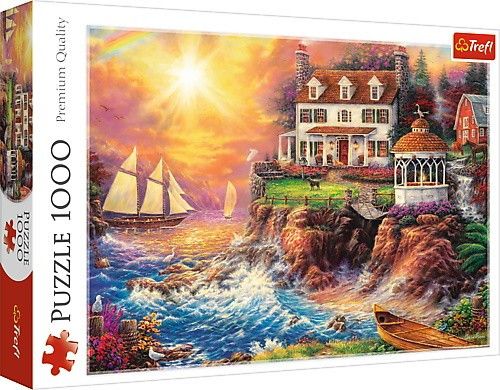 Puzzle składające się z 1000 elementów przedstawiające widok na morską przystań. Po ułożeniu powstanie obrazek o wymiarach 683x480 mm.