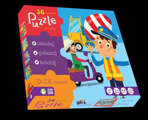 Seria puzzli wielkoelementowych z wyjątkowymi, kolorowymi ilustracjami. Dzięki dużym elementom i wygodnemu formatowi są idealne dla małych dzieci. Liczba puzzli i szczegółowość ilustracji są dostosowane do wieku dziecka: 2-latki układają obrazek składający się z 20 puzzli, a 4-latki z 36 elementów. Dodatkowo, puzzle zwierają ćwiczenie na spostrzegawczość sprawdź, czy znajdziesz wszystkie wskazane elementy w specjalnej ramce? Po ułożeniu puzzli pokoloruj kolorowankę znajdującą się na odwrocie układanki. Udanej zabawy!