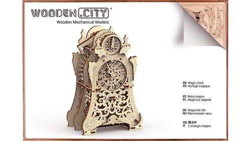 Zdobądź swój własny Magiczny Zegar, a nagle znajdziesz się w bajecznym kraju pełnym sekretów, miłości i zaklęć! Uruchom go i posłuchaj upływu czasu! Stały rytm wyznacza ulotne sekundy ... Tik-Tak ... Magiczny zegar to nie tylko zagadka 3D, on właściwie "żyje". Możesz obejrzeć cały mechanizm i przestudiować jego działanie. Będzie naprawdę fascynować i zabierze Cię do świata Pięknej i Bestii lub do jej adaptacji Szkarłatnego Kwiatu, a kogo z tych bajek mógłbyś zapamiętać? Oczywiście, mówiący zegar Cogsworth! Bajka i nauka w jednym. Do wahadła potrzebujesz tylko monety. Właściwa częstotliwość odchylania wahadła dla dokładnego upływu czasu zależy od jego wagi. Cóż za gra matematyczna! Jeden ruch zegara trwa pół godziny. Magiczny zegar 3D Puzzle autorstwa WOODEN.CITY składa się z dwóch tarcz - jednej godzinowej i jednej minutowej - mechanizm zegara i wahadło. Są wyrafinowane, kapryśne, a jednocześnie harmonijne - będą wyjątkową atrakcją Twojego domu. Zegary mechaniczne z precyzyjnie wykonaną rzeźbą w drewnie tworzą wyjątkowe prezenty dla Twoich bliskich, a składanie ich razem z nimi będzie dla ciebie niespotykanym hobby.