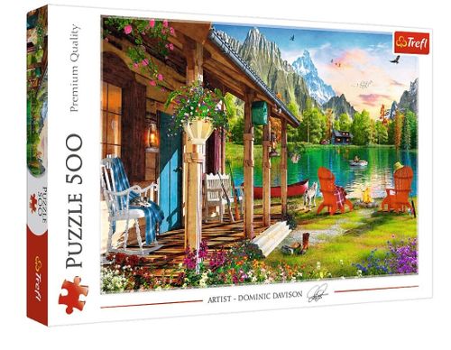 Domek w górach to puzzle 500 elementów przedstawiające dom z niesamowitym widokiem na jezioro i góry. Po ułożeniu powstanie obrazek o wymiarach 48x34 cm. Wysoką jakość, nasycenie kolorów i bezpieczeństwo układania zapewnia kalandrowany papier odbijający światło, pokryty ekologicznymi farbami spożywczymi