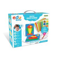 Kreatywny zestaw Puzzle Create&Draw - Sea, składa się z dwóch zestawów puzzli z tworzywa sztucznego, kredek ( 5 kolorów), farbek akwarelowych (12 kolorów), 5 arkuszy papieru kolorowego oraz dwustronnej mega-kolorowanki z zadaniami. Wszystkie te elementy mieszczą się w wygodnym opakowaniu-teczce z rączką, która służy do przechowywania zabawki oraz plac plastycznych.