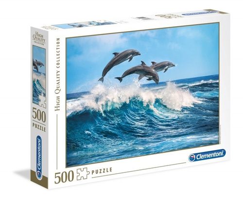 Puzzle przedstawiające wesoło skaczące delfiny.