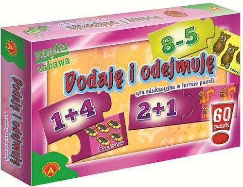 "Nauka + zabawa" to seria gier stworzonych na podstawie nowoczesnych metod nauczania dzieci poprzez zabawę. Gry te pomagają rozwijać myślenie logiczne, kojarzenie faktów, uczą podstaw matematyki, czy alfabetu. Każda gra składa się z 30 par puzzli, które należy połączyć w pary według wskazanego klucza. "Dodaję i odejmuję" to gra, w której dzieci muszą odnaleźć jak najwięcej pasujących do siebie par puzzli. Po połączeniu właściwych puzzli gracz czyta wynik oraz nazwę obrazka. Wygrywa ten, kto ułoży najwięcej puzzli i prawidłowo wymówi znajdujące się na nich wyrazy. Do gry dołączona jest instrukcja podpowiadająca prawidłowe połączenie puzzli.Zawartość pudełka: 60 puzzli, instrukcja