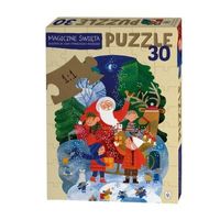 Dźwięk dzwoneczków niesie się po całym lesie. Ktoś jedzie saniami prowadzonymi przez renifera w czerwonej czapce. To Święty Mikołaj! Towarzyszą mu dwa skrzaty. Mają ręce pełne roboty, bo muszą dziś odwiedzić wszystkie dzieci. Każdy, duży czy mały, dostanie świąteczny podarunek. Nawet rodzina małych myszek wyszła z norek, aby świętować w tę magiczną noc. Świąteczna ilustracja Ewy Poklewskiej-Koziełło została podzielona na 30 dużych elementów. Po ich ułożeniu powstaje obrazek o wymiarach 57,5 × 38,7 cm.