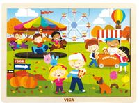 Zabawka wykonana z drewna. Na drewnianej podstawie znajdują się 24 puzzle. Układankę można układać na podstawie lub poza nią.