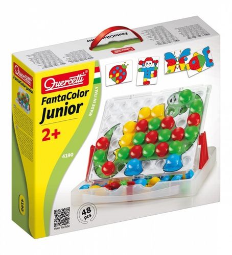 Quercetti Mozaika Fantacolor Junior zestaw zawiera kolorowe kołeczki o średnicy 32mm, z których powstają piękne mozaiki. Aby tak się stało należy jedną z 8 kart ze wzorami umieścić pod przezroczystą tablicą, a następnie zacząć tworzyć mozaikę poprzez wstawianie kolorowych kołeczków w tablicę. Karty i kołeczki przechowywane są w zamykanej walizeczce z uchwytem. Zabawka rozwija koordynację wzrokowo-ruchową , precyzyjne umiejętności motoryczne oraz zachęca do twórczego myślenia.Wiekod 2 lat