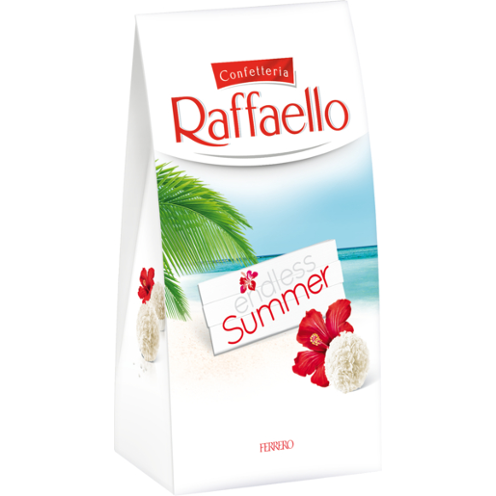RAFFAELLO to wyrafinowany smak, doskonały na każdą elegancką okazję. Kruchy wafelek otacza wyjątkowe wnętrze z aksamitnej niepowtarzalnej masy, w której sercu znajduje się cały migdał. Dzieło wieńczą delikatne wiórki kokosowe, którymi obsypana jest pralina. Bombonierka RAFFAELLO to upominek dla kogoś wyjątkowego.