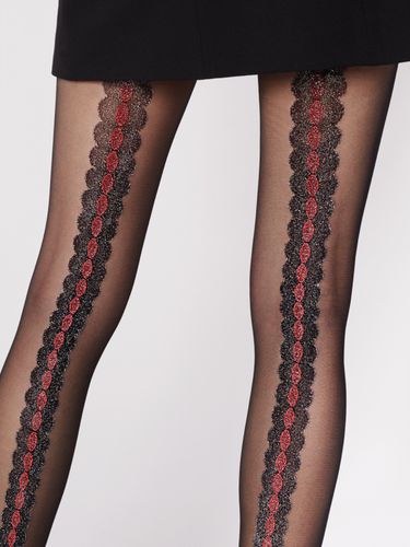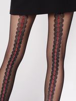 Rajstopy ze szczyptą włoskiego przepychu - przód spokojny, gładki, tył z wyraźnym rysunkiem czerwono-czarnych kółek. Odważnie i modnie. Grubość: 20 den. Skład: 90% poliamid, 4% elastan, 3% przędza metalizowana.