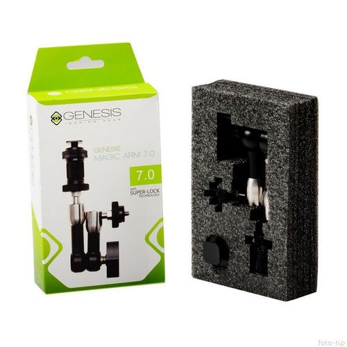 Genesis Magic Arm 7” to uniwersalne mocowanie pozwalające podłączyć do rigów lub statywów naramiennych dodatkowe akcesoria. Ramię wyposażone jest w dwie standardowe śruby 1/4” dzięki czemu może być stosowane z wieloma akcesoriami wideo i fotograficznymi takimi jak mikrofony, ekrany, lampy, wyzwalacze i sterowniki radiowe, itd. Trzy niezależnie regulowane przeguby pozwalają dowolnie zmieniać położenie ramienia i doczepionych do niego akcesoriów względem kamery lub aparatu.