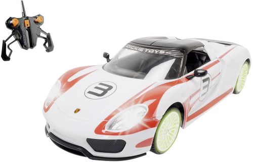 Samochód RC (R)Porsche Spyder 918 RTR 1119075. Wspaniała wersja samochodu z wyjątkowym designem, nawiązującym do wyglądu sportowych aren. Auto posiada funkcje, które dodają zabawie niezwykłych emocji. Świecące reflektory, oryginalne efekty dźwiękowe, klakson na pewno spodobają się małemu wielbicielowi motoryzacji. Samochód sterowany jest za pomocą prostego w obsłudze pilota. Porusza się do przodu, w prawo i lewo, do tyłu, w prawo i lewo, zatrzymuje się. Auto osiąga maksymalną prędkość na poziomie 10 km/h.Cechy i zawartość zestawu: sportowy samochód RC na licencji Porsche 2 kanały 2.4 GHz funkcja świetlna funkcja dźwiękowa prędkość 10 km/h długość 29 cm pełen zakres ruchu: do przodu, w prawo i lewo, do tyłu, w prawo i lewo, stop