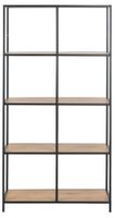 Regał Seaford został zrobiony z wytrzymałego metalowego szkieletu oraz pięciu półek z MDF oklejonych okleiną. Metalowa konstrukcja została pomalowana proszkowo na czarno. Jej matowe wykończenie nadaje całości elegancji. Okleina na półkach idealnie imituje strukturę drewna dębu. Regał stoi na niewysokich nóżkach. Waga: 17,5 kg. Wymiary kartonu: 11cm x 154,5cm x 37,5cm Wysokość: 150