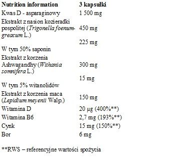 Informacja żywieniowa: 3 kapsułki: kwas D-asparaginowy 1500 mg; ekstrakt kozieradki pospolitej (Trigonella foenum-greacum L.) 450 mg, w tym 50% saponin 150 mg; ekstrakt ashwagandhy KSM-66 (Withania somnifera L.) 300 mg, w tym 5% witanolidów 15 mg; ekstrakt maca (Lepidium meyenii Walp.) 150 mg; witamina D 20 µg (400%**); witamina B6 2,7 mg (193%**); cynk 15 mg (150%**); bor 6 mg.