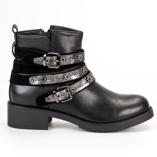Czarne botki Sixth Sense wykonane z ekologicznej skóry to modne rozwiązanie dla każdej kobiety, ceniącej rockowe stylizacje. Obuwie świetnie się prezentuje i można je nosić na co dzień. Buty posiadają ozdobne sprzączki w kolorze szarości, dzięki czemu ożywiają ubiór - do tego nosi się je wyjątkowo wygodnie.