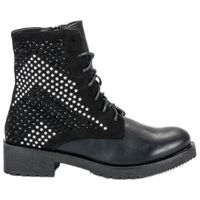 Czarne rockowe botki workery Butymodne wykonane zostały z zamszu oraz skóry ekologicznej. Ich ozdobą są liczne cyrkonie w kolorze czarnym oraz srebrnym. To właśnie one nadają charakteru temu modelowi i całym stylizacjom, dopasowanym do niego. Buty te posiadają obcas o wysokości 4cm oraz suwak i sznurówki.