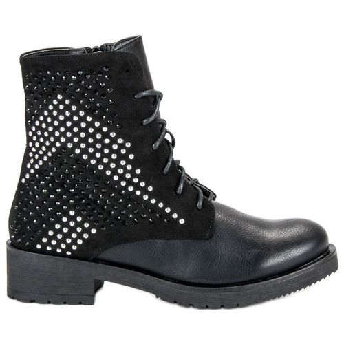 Czarne rockowe botki idealne dla każdej kobiety lubiącej nie codzienny wygląd. Buty wykonane zarówno ze skóry ekologicznej, jak i zamszu. Cholewka wysadzana jest niewielkimi dżetami, przez co obuwie efektownie się prezentuje. Mocna, gumowa podeszwa zapobiega poślizgom podczas chodzenia. Dedykowane na jesień i zimę.