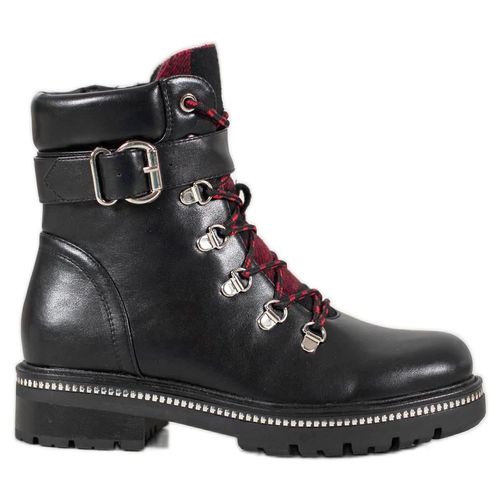 Rockowe workery utrzymane w niesztampowym stylu to prawdziwa gratka dla stylowych kobiet. Jest to model w kolorze czarnym, jednak wzrok przyciągają tutaj ciemnoczerwone detale. Całość prezentuje się wyjątkowo efektownie.