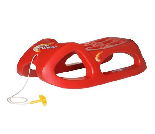 Czerwone sanki Snow Cruiser z wygodnym sznurkiem do ciągnięcia. Sanki wyposażone są w metalowe ślizgi, całość ma bardzo ergonomiczny kształt.