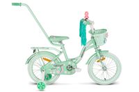 Rama stalowa Hi-Ten . Koła: aluminiowe 16" malowane pod kolor Rozmiar ramy 10" Widelec stalowy Piasta przód stalowa łożyska stalowe kulkowe Piasta tył torpedo z hamulcem na pedały, łożyska stalowe kulkowe Ilość biegów 1 Mechanizm korbowy 1-rz Dźwignia hamulcowa plastikowa Hamulec przód caliper z klamką na kierownicy Hamulec tył torpedo (nożny) na pedały Wspornik kierownicy stalowy Wyposażenie błotniki, bagażnik, wstążki przy kierownicy, koszyczek na kierownicę, kółka boczne, prowadnik do nauki jazdy, pełna osłona łańcucha, trąbka, odblaski, pedały.
