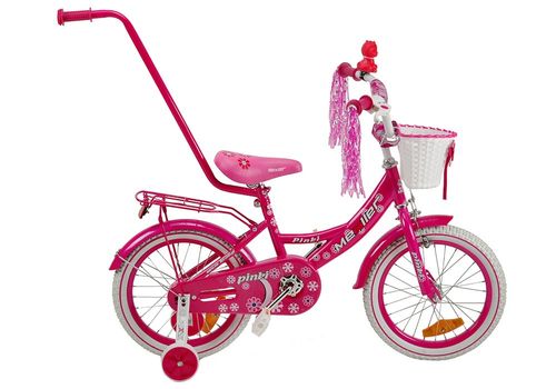 Rama stalowa Hi-Ten . Koła: aluminiowe 16" malowane pod kolor Rozmiar ramy 10" Widelec stalowy Piasta przód stalowa łożyska stalowe kulkowe Piasta tył torpedo z hamulcem na pedały, łożyska stalowe kulkowe Ilość biegów 1 Mechanizm korbowy 1-rz Dźwignia hamulcowa plastikowa Hamulec przód caliper z klamką na kierownicy Hamulec tył torpedo (nożny) na pedały Wspornik kierownicy stalowy Wyposażenie błotniki, bagażnik, wstążki przy kierownicy, koszyczek na kierownicę, kółka boczne, prowadnik do nauki jazdy, pełna osłona łańcucha, trąbka, odblaski, pedały.