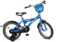 Rower dziecięcy na kołach 16”. Wersja dla chłopców. Kształt ramy z obniżoną górną rurką ułatwia wsiadanie i zsiadanie. Wygodne i trwałe siodełko. Wygodne chwyty kierownicy. Hamulec w tylnej pieście oraz przedni typu V-Brake umożliwiają dziecku instynktowne, pewne hamowanie. Wytrzymałe kółka boczne o regulowanej wysokości ułatwiają naukę jazdy na rowerze. Szerokie opony zapewniają stabilność w czasie jazdy. Osłonki na poprzeczce kierownicy i mostku oraz osłona łańcucha pomagają chronić dziecko przed urazami w razie ewentualnego upadku. Światła odblaskowe, błotniki i dzwonek. Rama: Hi-Ten Widelec: Hi-Ten Korba: 1-częściowy stalowy, 28 zębów Kaseta: 18 zębów Łańcuch: KMC 410 Hamulce: przód: aluminiowy V-brake; tył: torpedo (w piaście) Obręcze: stalowe Opony: DURO 16" x 2,125" AV Kierownica: stalowa gięta BMX Wspornik siodełka: stalowy 25,4 mm
