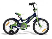Rower dziecięcy na kołach 16”. Kształt ramy z obniżoną górną rurką ułatwia wsiadanie i zsiadanie. Wygodne i trwałe siodełko. Wygodne chwyty kierownicy. Hamulec w tylnej pieście umożliwi dziecku instynktowne, pewne hamowanie. Wytrzymałe kółka boczne ułatwiają naukę jazdy na rowerze. Szerokie opony zapewniają stabilność w czasie jazdy. Światła odblaskowe, błotniki i dzwonek.